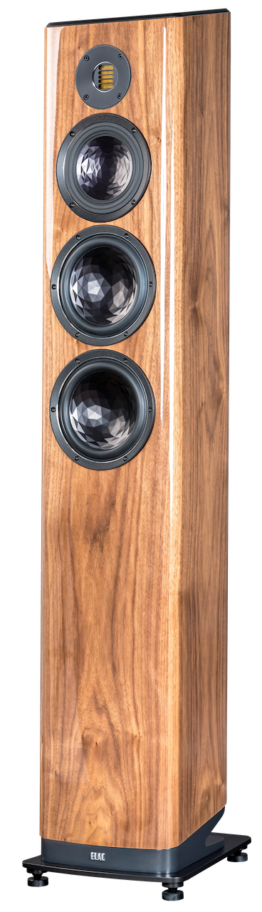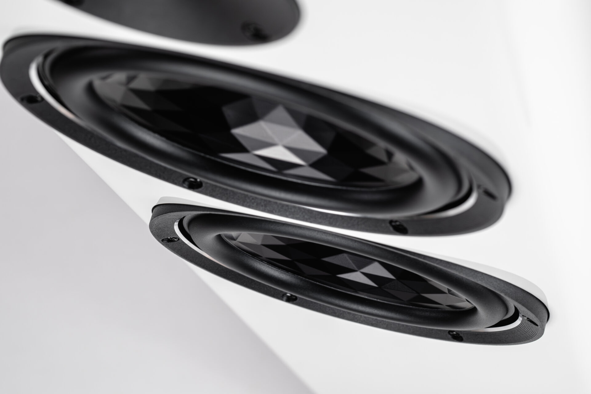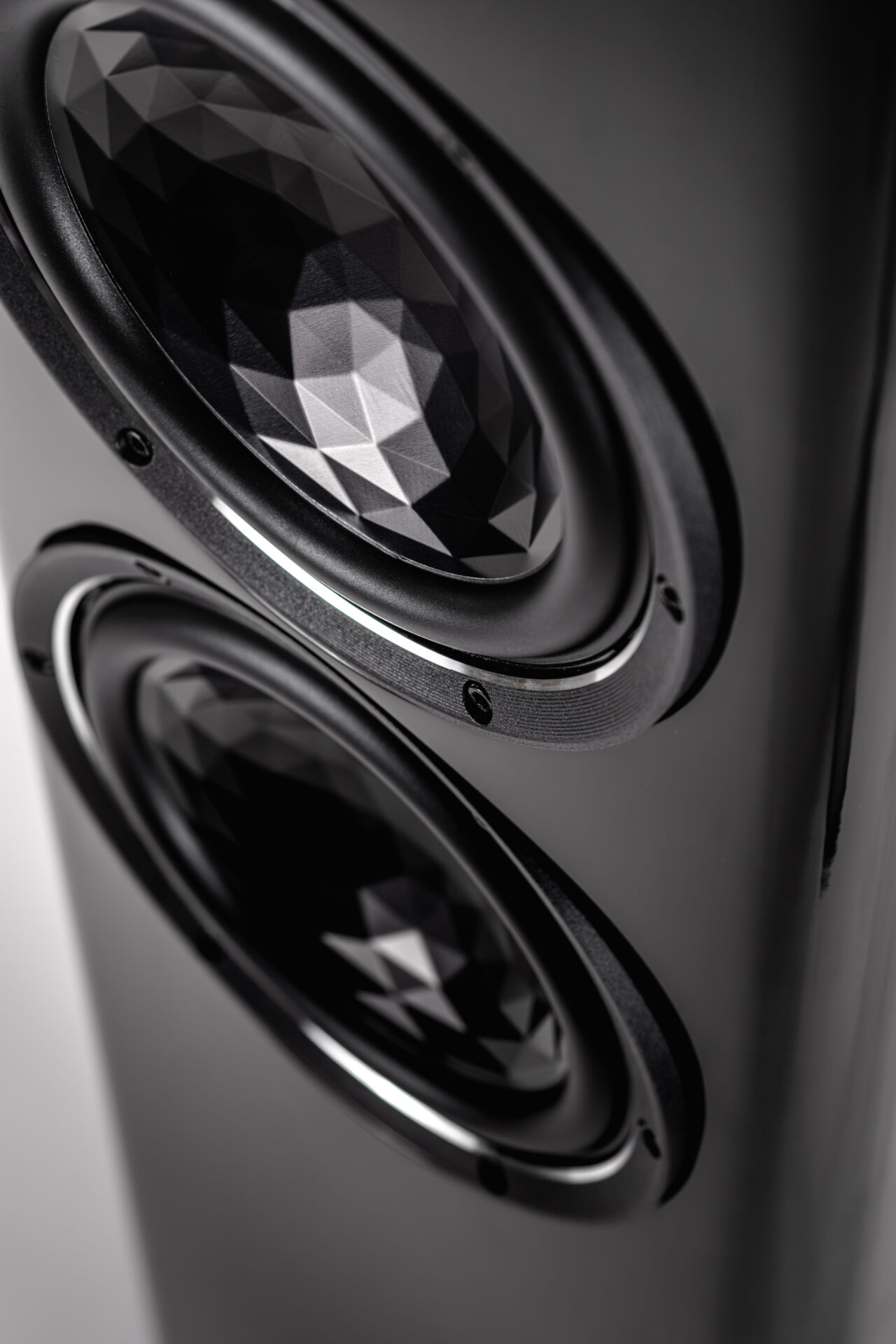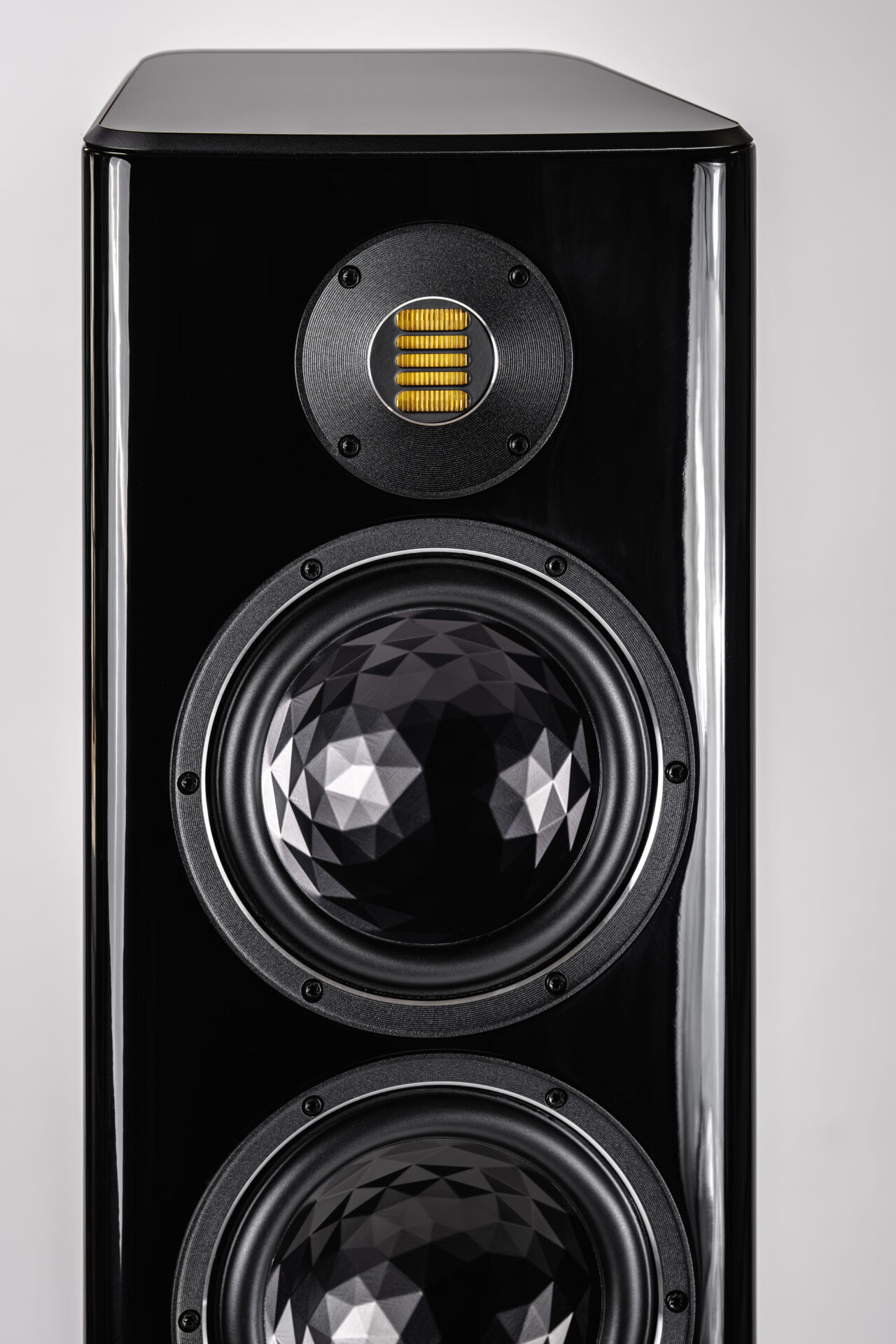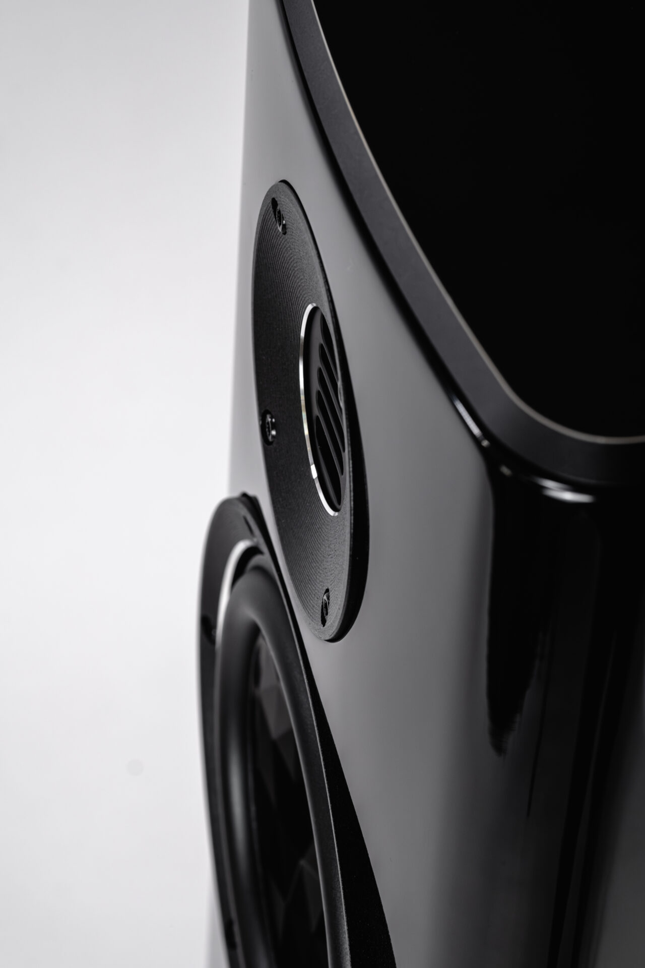 Crafted with precision, this refined design showcases high-gloss lacquered and wooden veneered cabinets, distinguished by their striking trapezoid shape featuring angled rearward panels seamlessly complemented by aluminum accents. Not only does this design command attention, but it also elevates acoustic performance to new heights.