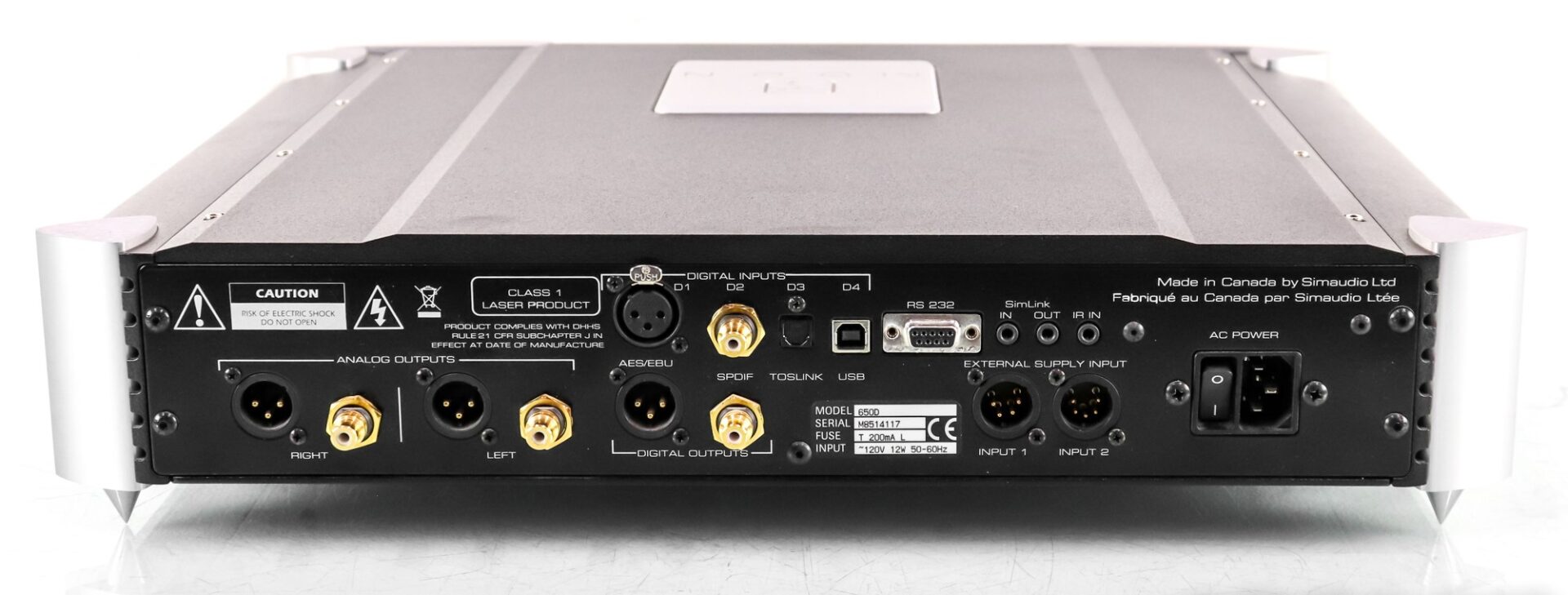 You can also see here the analog outpus: S/PDIF, AES/EBU (XLR), IEC power chord intlet, A RS-232 port for firmware updates, a SimLink for communication with other Simaudio components and two XLR connectors for an external power supply that is sold separately.