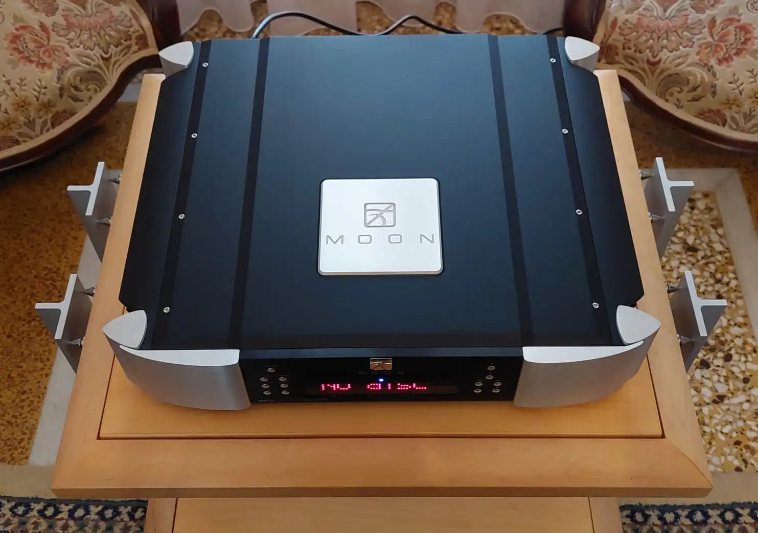 The CD player is a part of Simaudio’s proprietary M-Quattro Drive transport, mounted on a gel-based, four point floating suspension.